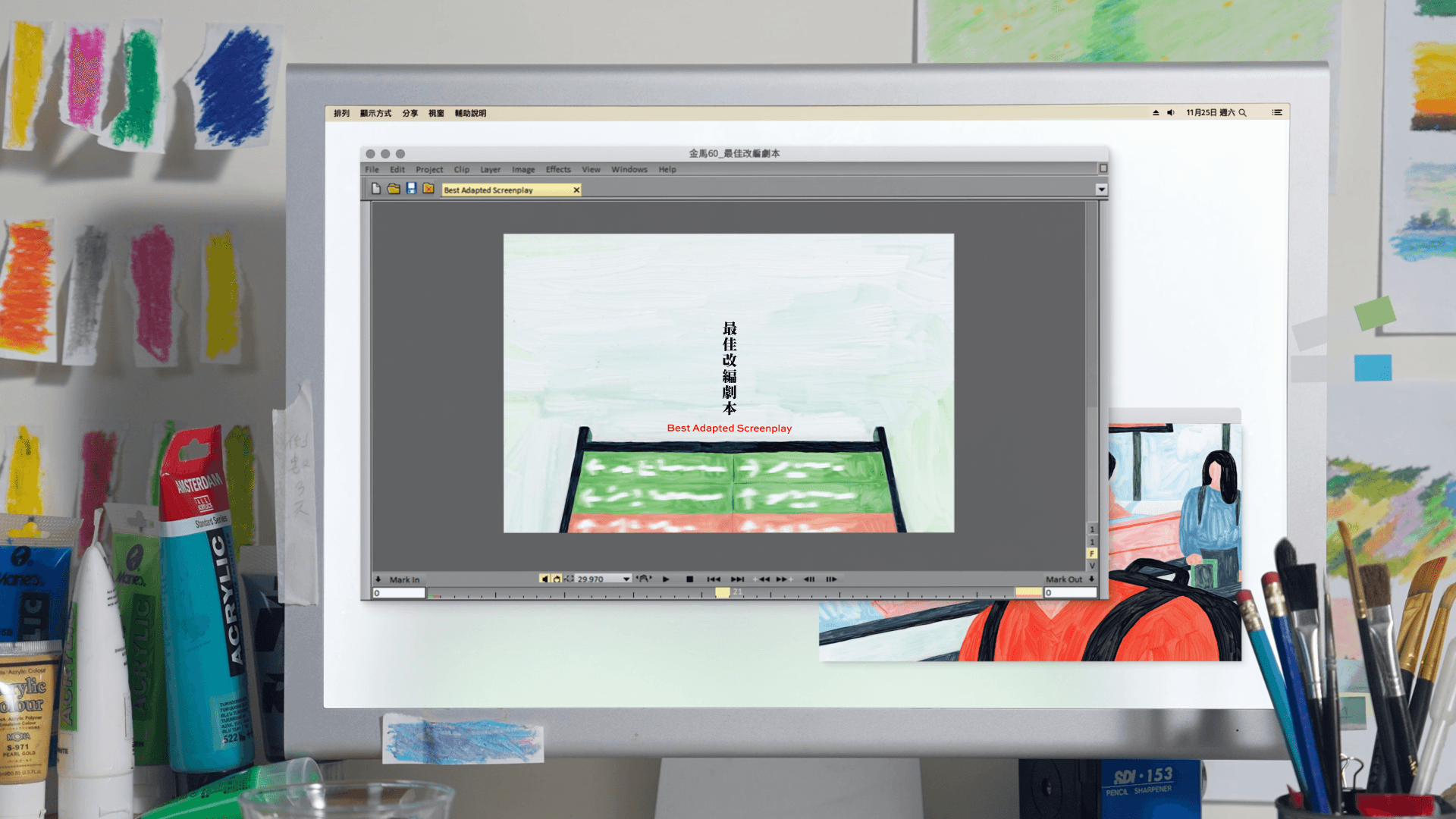 Four awards were presented among the nominations : Best Original Screenplay, Best Adapted Screenplay, Best Art Direction, Best Makeup & Costume Design To actualize the concept of "Behind the Scenes of a Film Creative's Desktop", we recreated the desks of four different film professionals by using real scripts, props, and costumes. The production process was recorded through time-lapse cinematography highlighting the time and effort behind traditional animation.